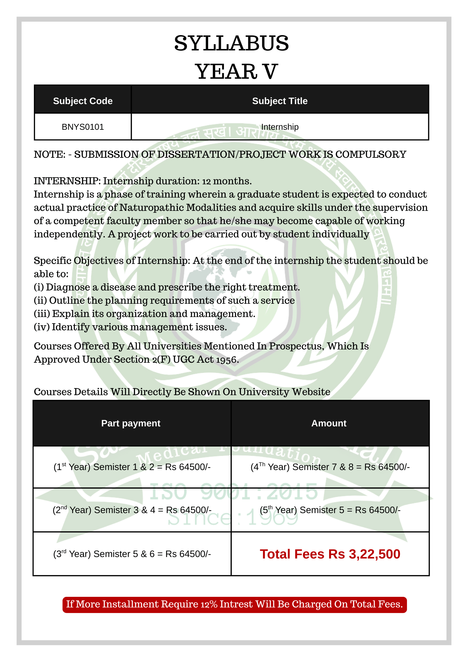 BRIEF DESCRIPTION 5 & 1/2 Year Medical Degree in Naturopathy & Yoga (4 years 6 months + 1 year Internship) Degree Recognized by AYUSH & Approved by UGC (University Grants Commission Of Asian International University) Successful Students after completion of BNYS are eligible for Central Registration from Central Council for Research in Yoga & Naturopathy (CCRYN), Ministry of AYUSH, Govt. of India
